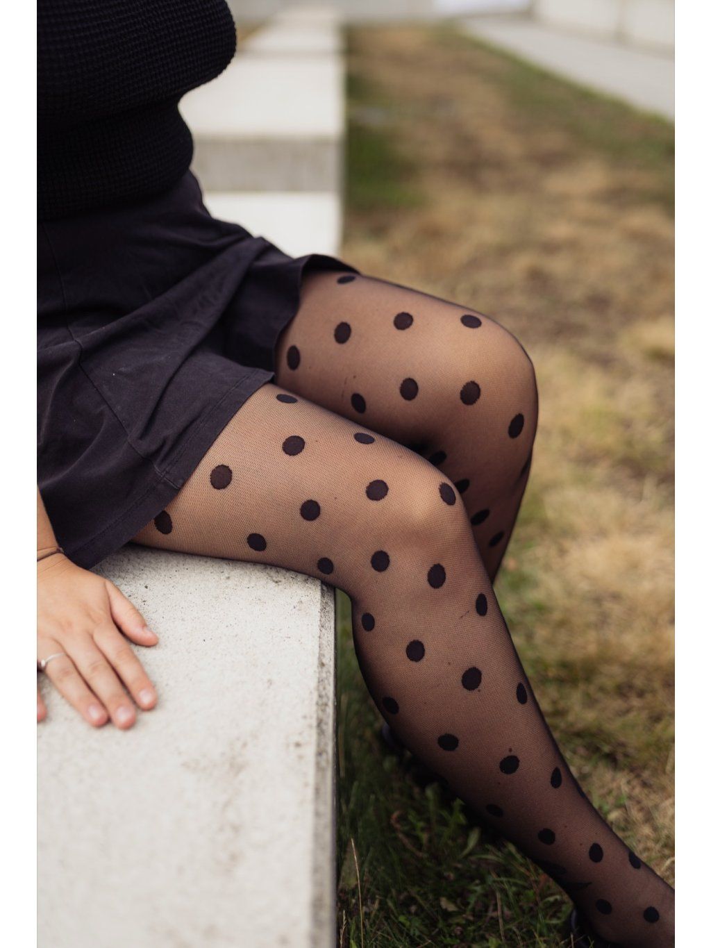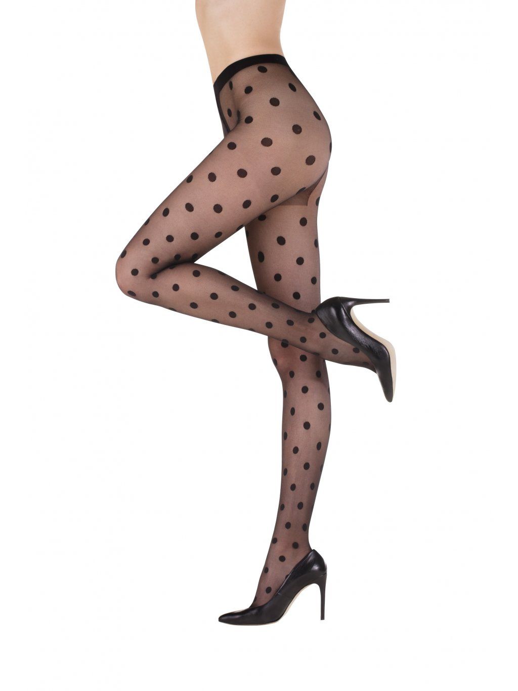 Matné punčocháče se vzorem hrubé síťky pokryté velkými puntíky. Bez zesílené špičky a paty.