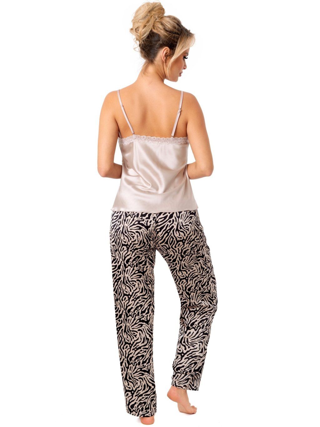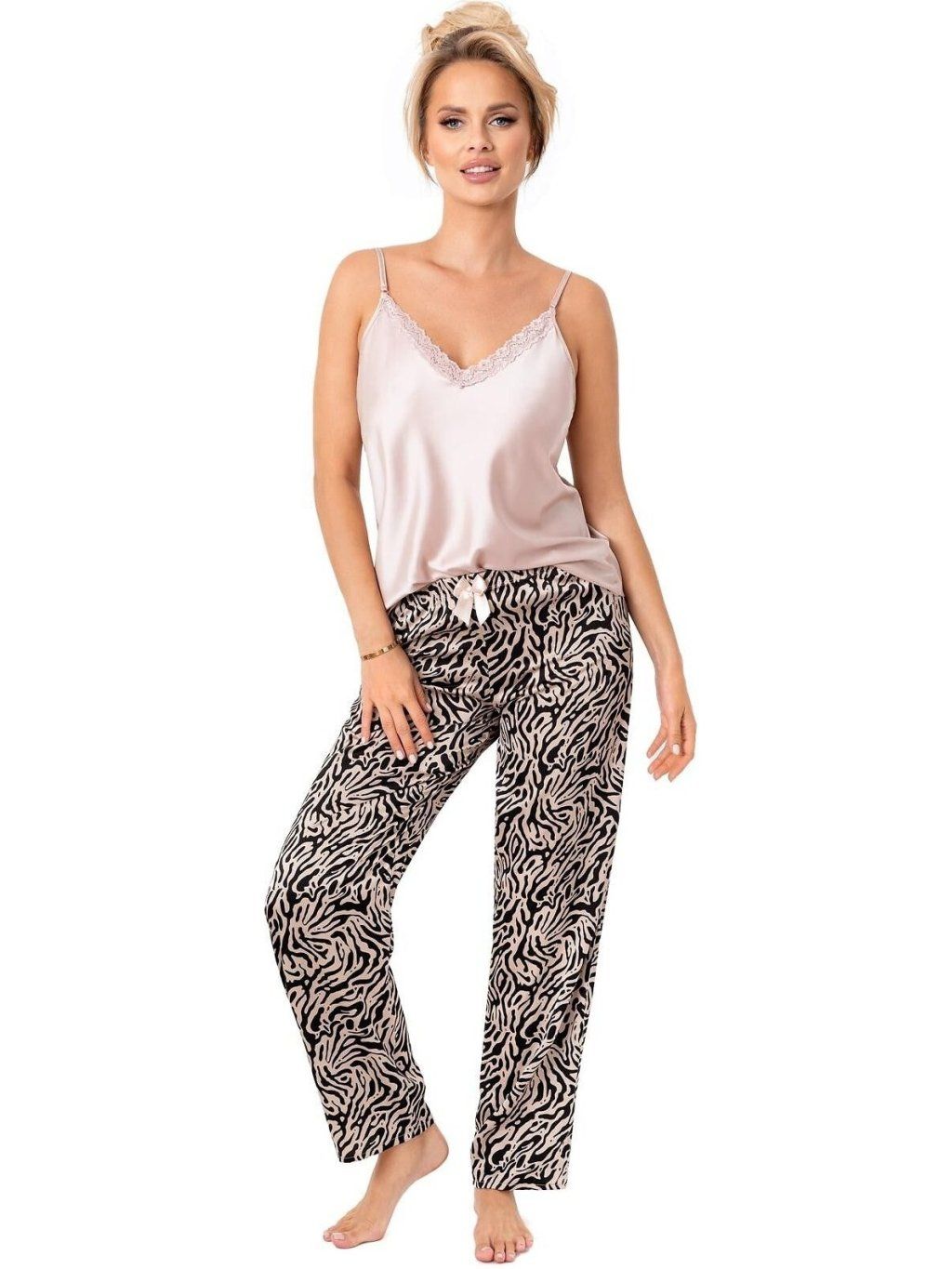 Dámské dvoudílné pyžamo z jemného a splývavého saténu krásně ochladí v letních měsících. Horní díl v béžové  barvě má nastavitelná ramínka a krajku kolem výstřihu. Dlouhé nohavice v béžovo-černé barvě se zvířecím vzorem, pružným pasem, který má ozdobnou mašličku ke stažení.