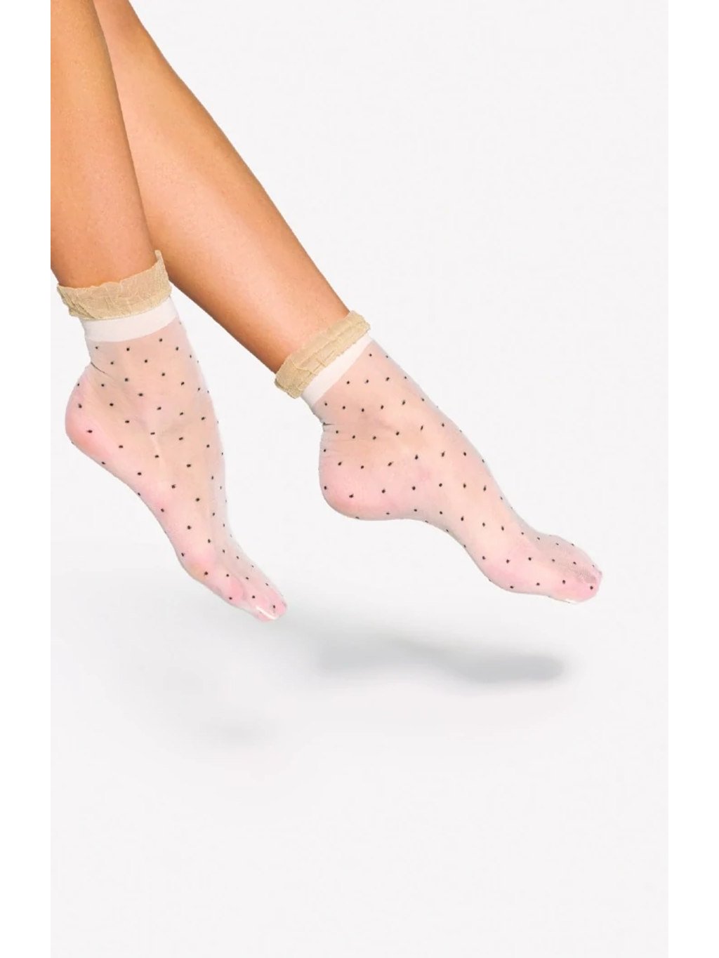 Silonové černé ponožky s jemným bílým puntíkem a krajkovým lemem se stříbrným efektem.